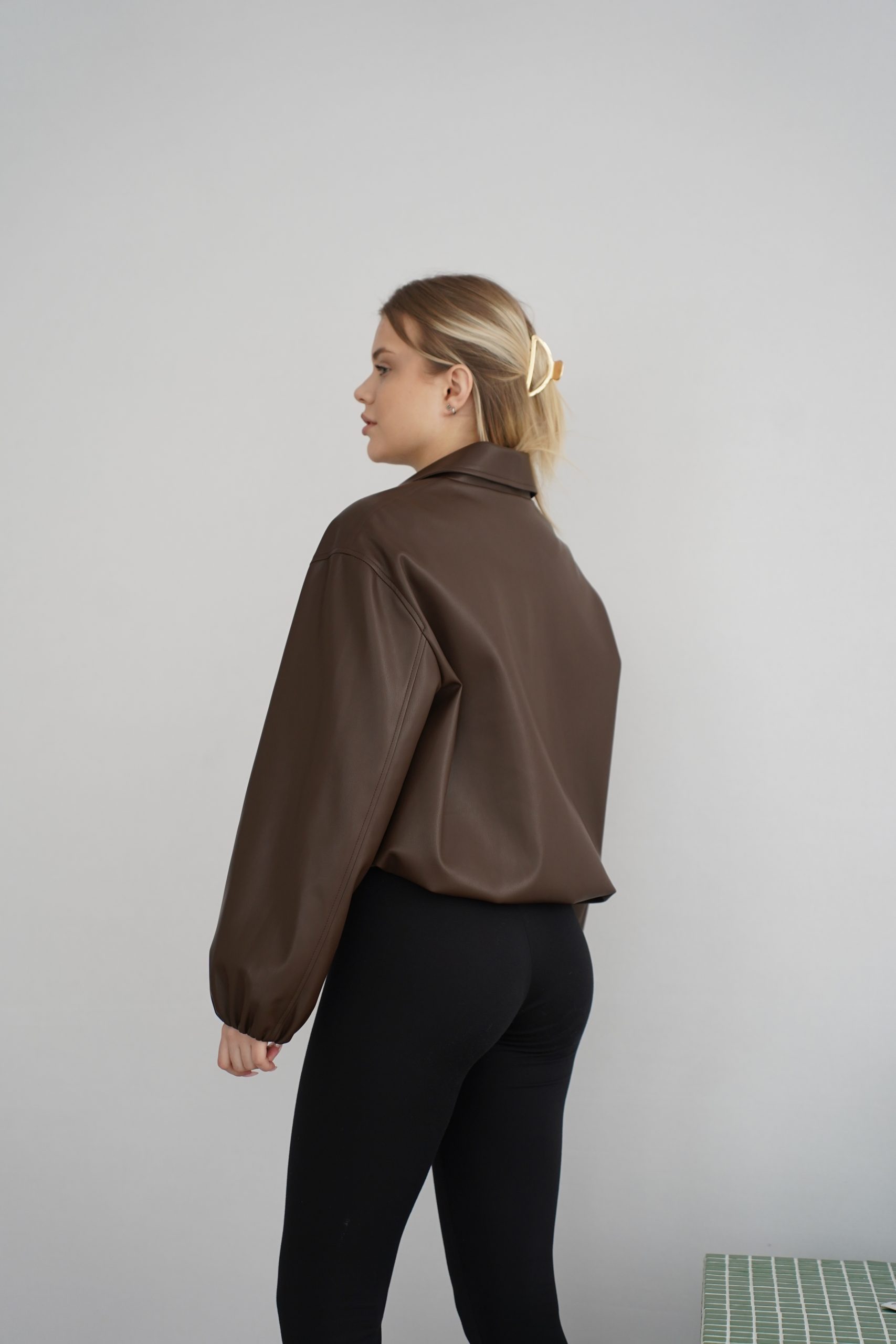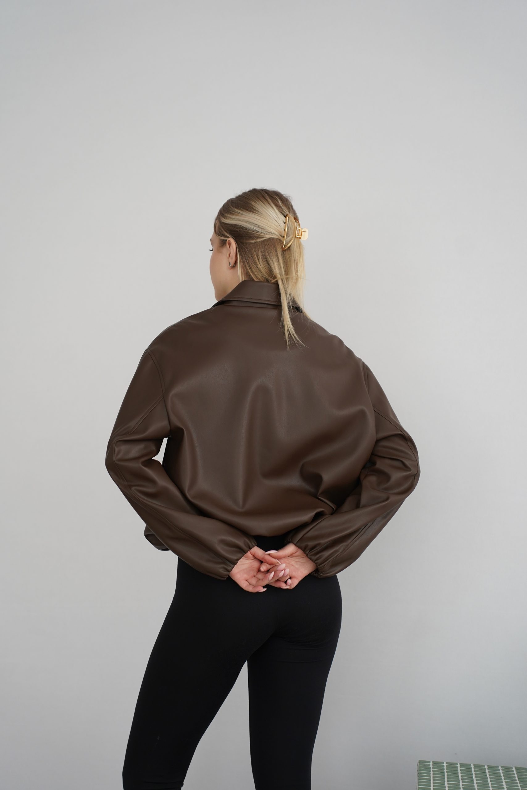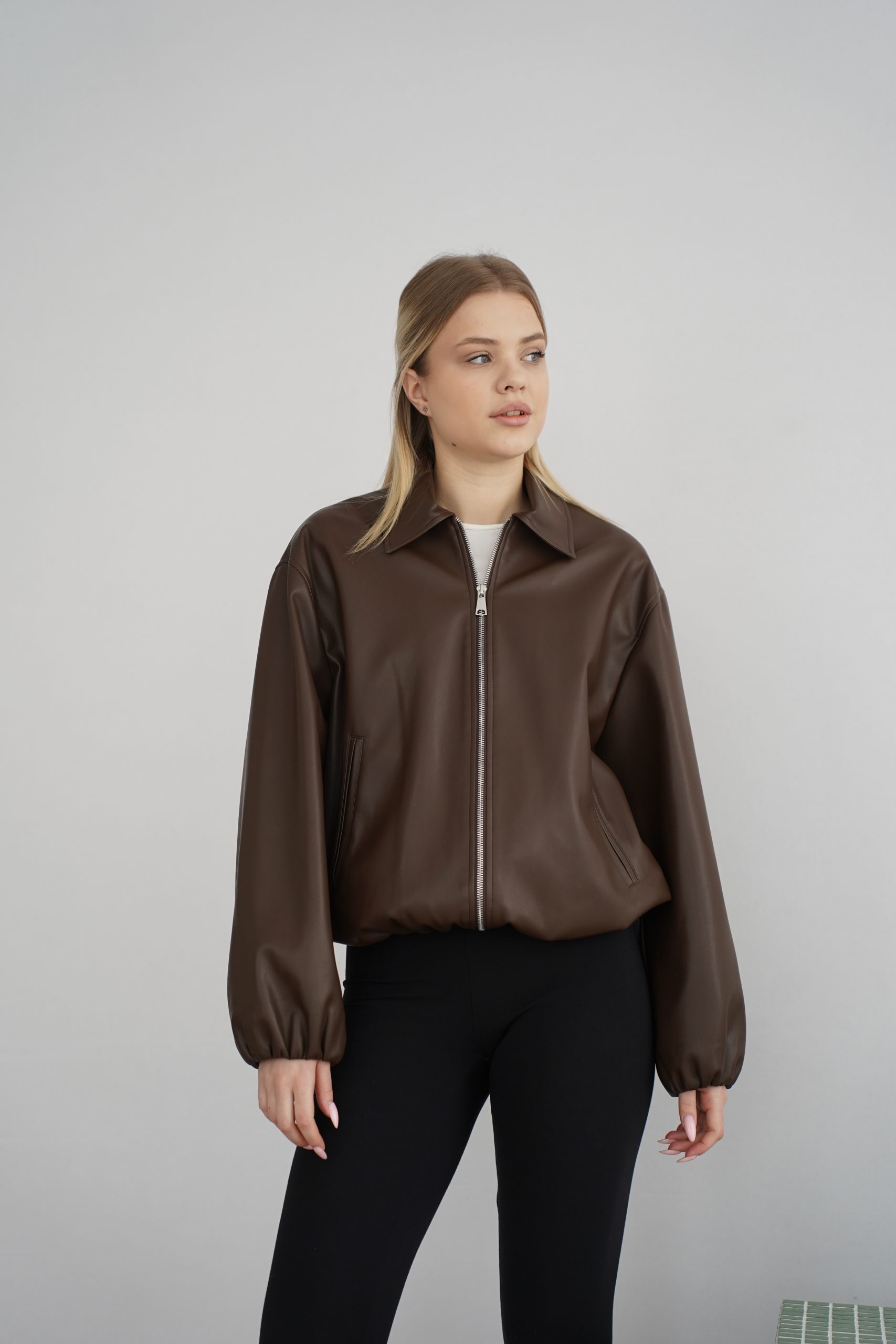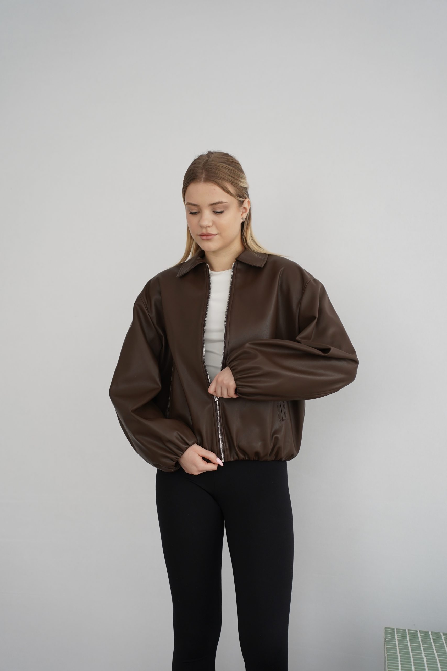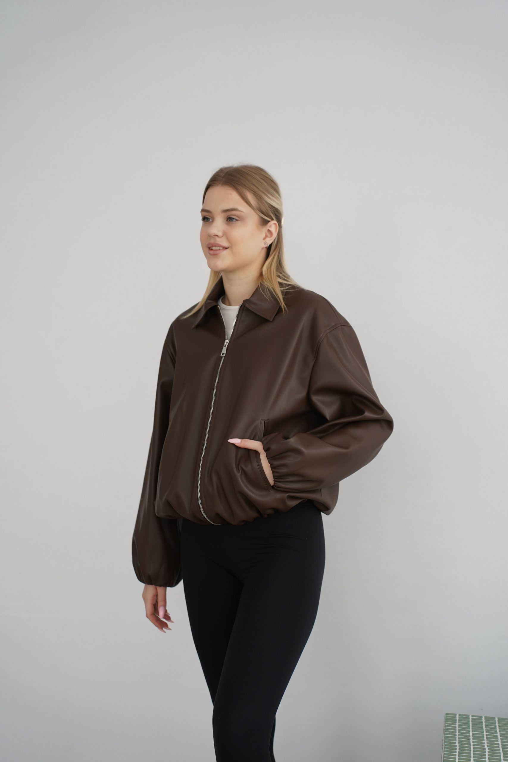 Стильный демисезонный бомбер из эко-кожи — трендовая модель, которая станет акцентом любого образа. Глубокий шоколадный оттенок придаёт изделию благородство и универсальность, позволяя легко сочетать его как с базовыми вещами, так и с более яркими элементами гардероба.