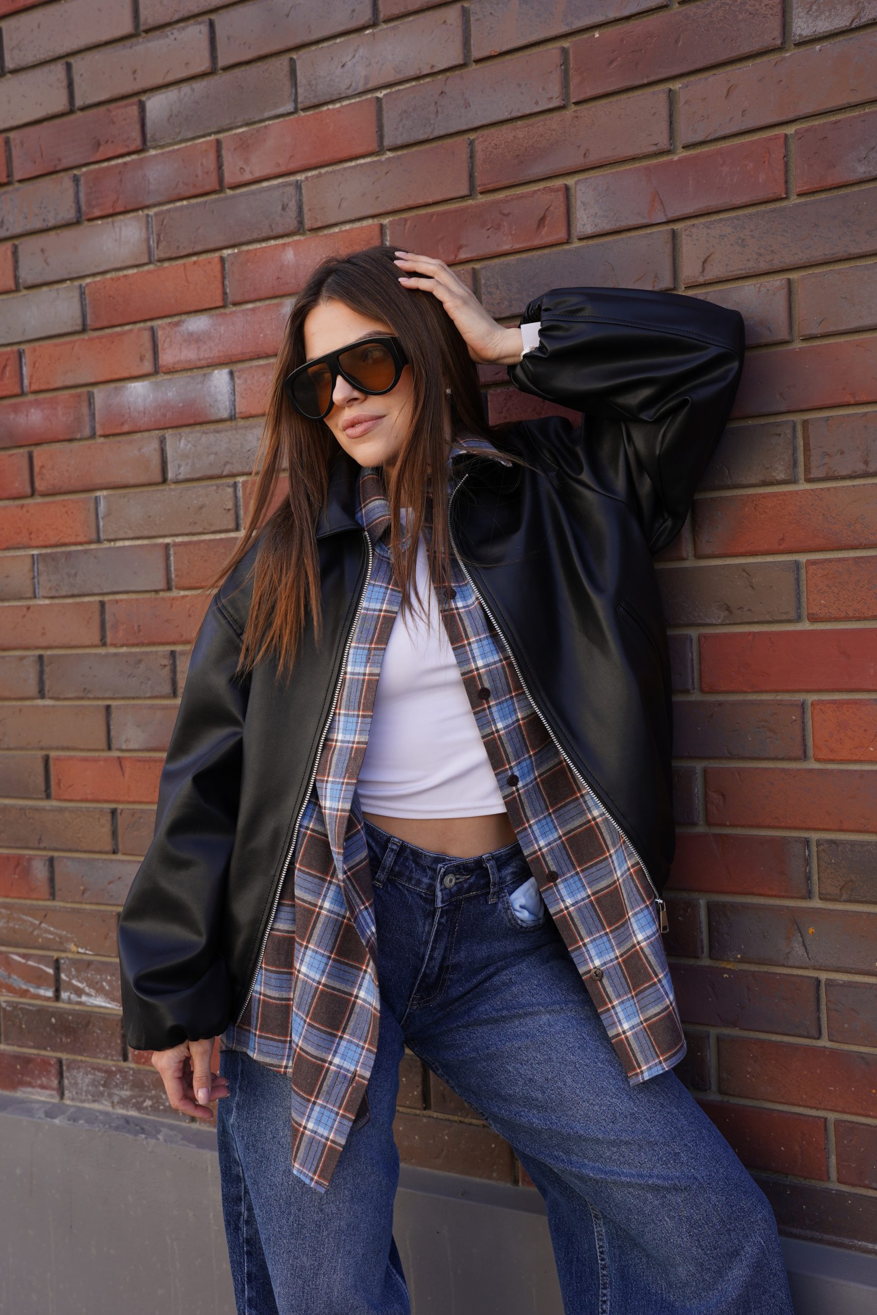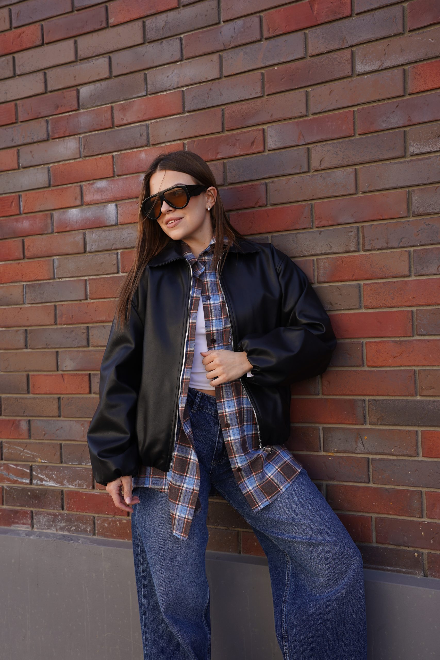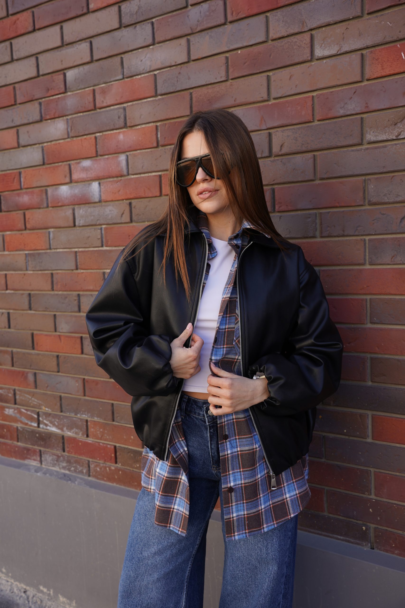 Бомбер выполнен из качественной эко-кожи с мягкой, гладкой текстурой и лёгким матовым блеском. Материал хорошо держит форму, приятен на ощупь и отлично подходит для весенне-осеннего сезона. Он защищает от ветра и сохраняет комфорт в прохладную погоду.