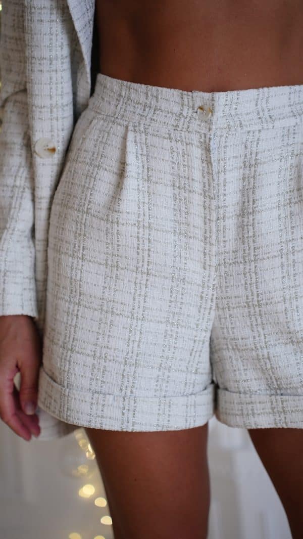 Твидовые шорты — это воплощение элегантности в повседневном гардеробе. Их фактура создаёт эффектный, благородный образ, который подойдёт как для повседневных выходов, так и для более изысканных сочетаний. Светлый оттенок делает модель особенно универсальной и придаёт свежесть любому наряду.