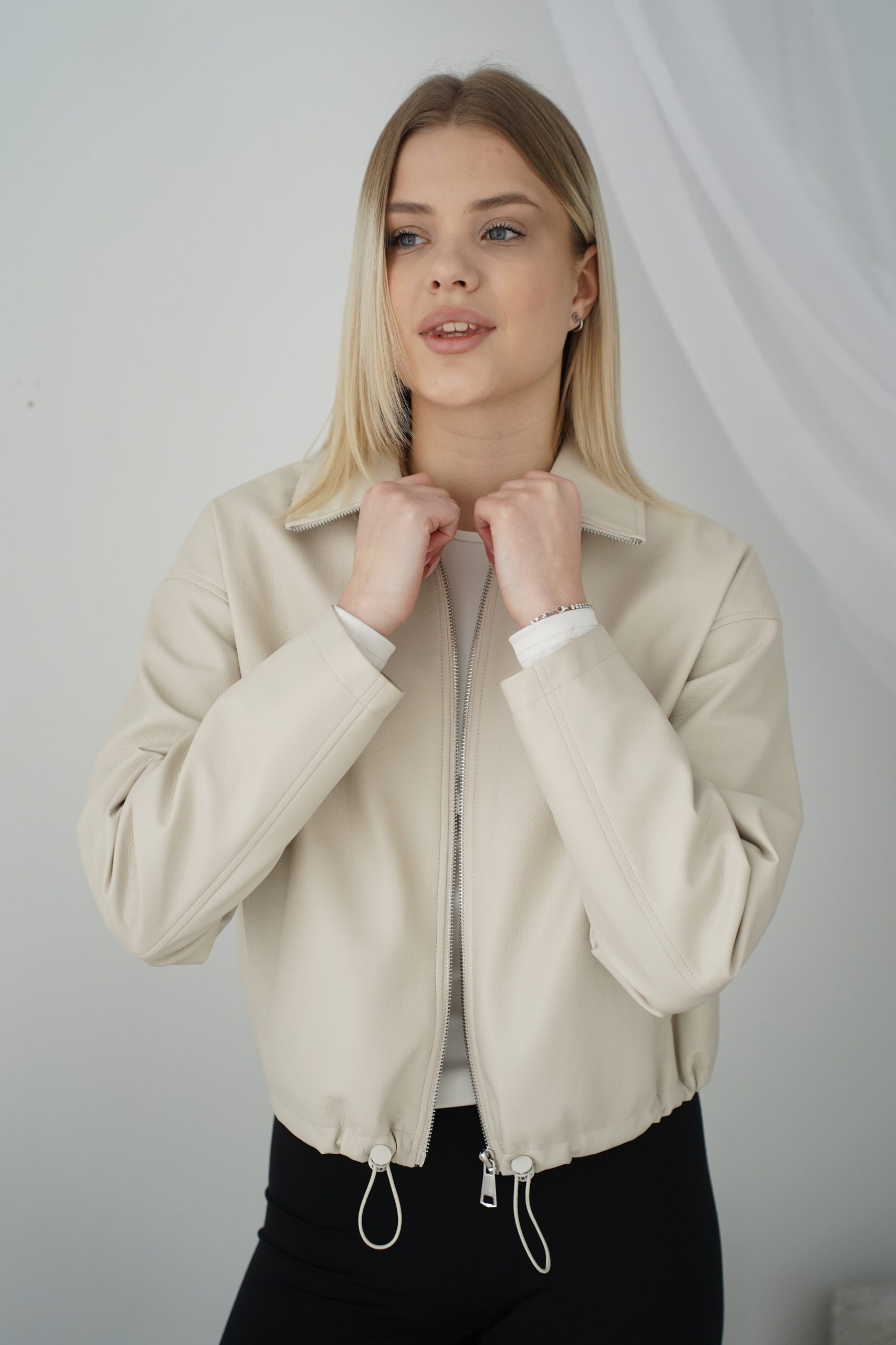 Демісезонний бомбер з екошкіри – стильна та універсальна модель для створення сучасних міських образів. Ніжний молочний відтінок надає виробу легкості та елегантності, роблячи його ідеальним вибором для весняно-осіннього сезону. Такий колір легко поєднується з базовим гардеробом та додає образу свіжості.