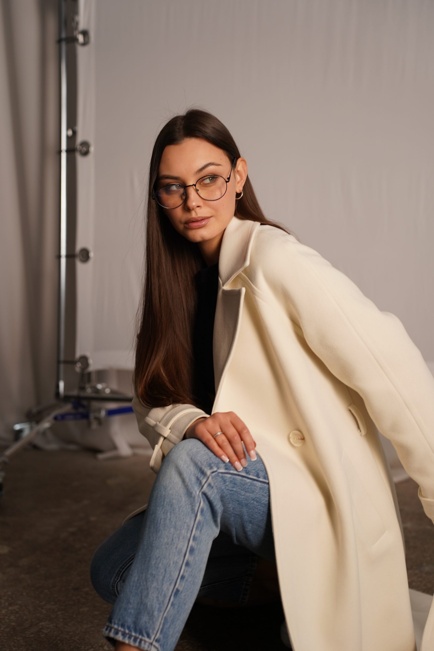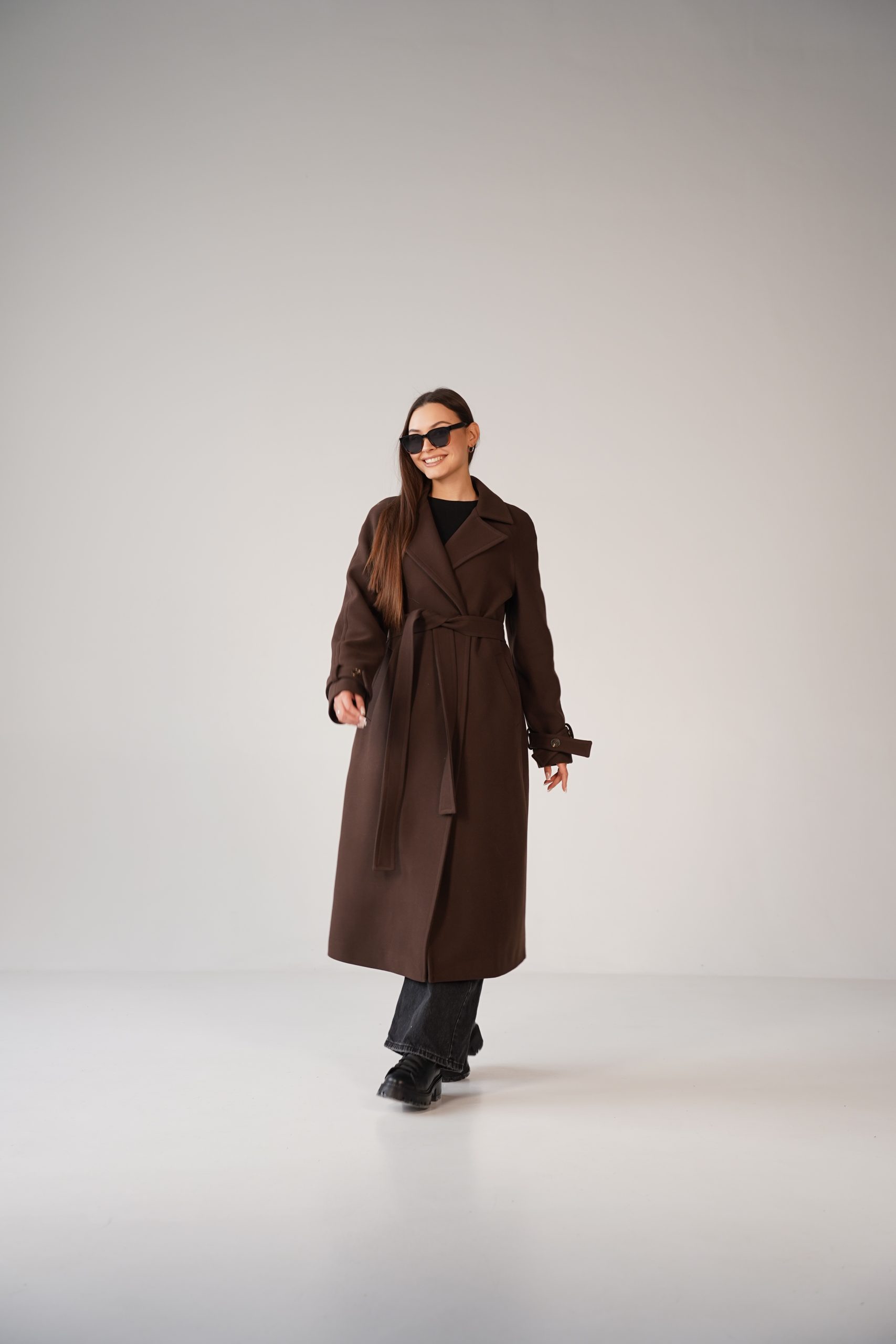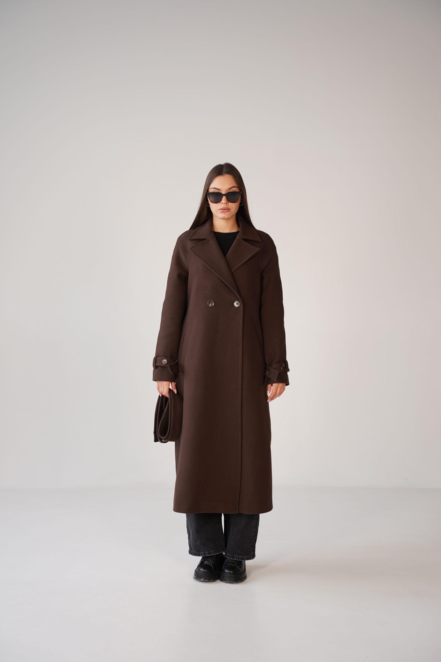 Модель має прямий подовжений силует, який візуально видовжує фігуру та створює елегантний образ. Вільний крій забезпечує комфорт при носінні і дозволяє легко одягати пальто поверх светрів або жакетів. Такий фасон робить виріб універсальним та актуальним незалежно від модних тенденцій.
