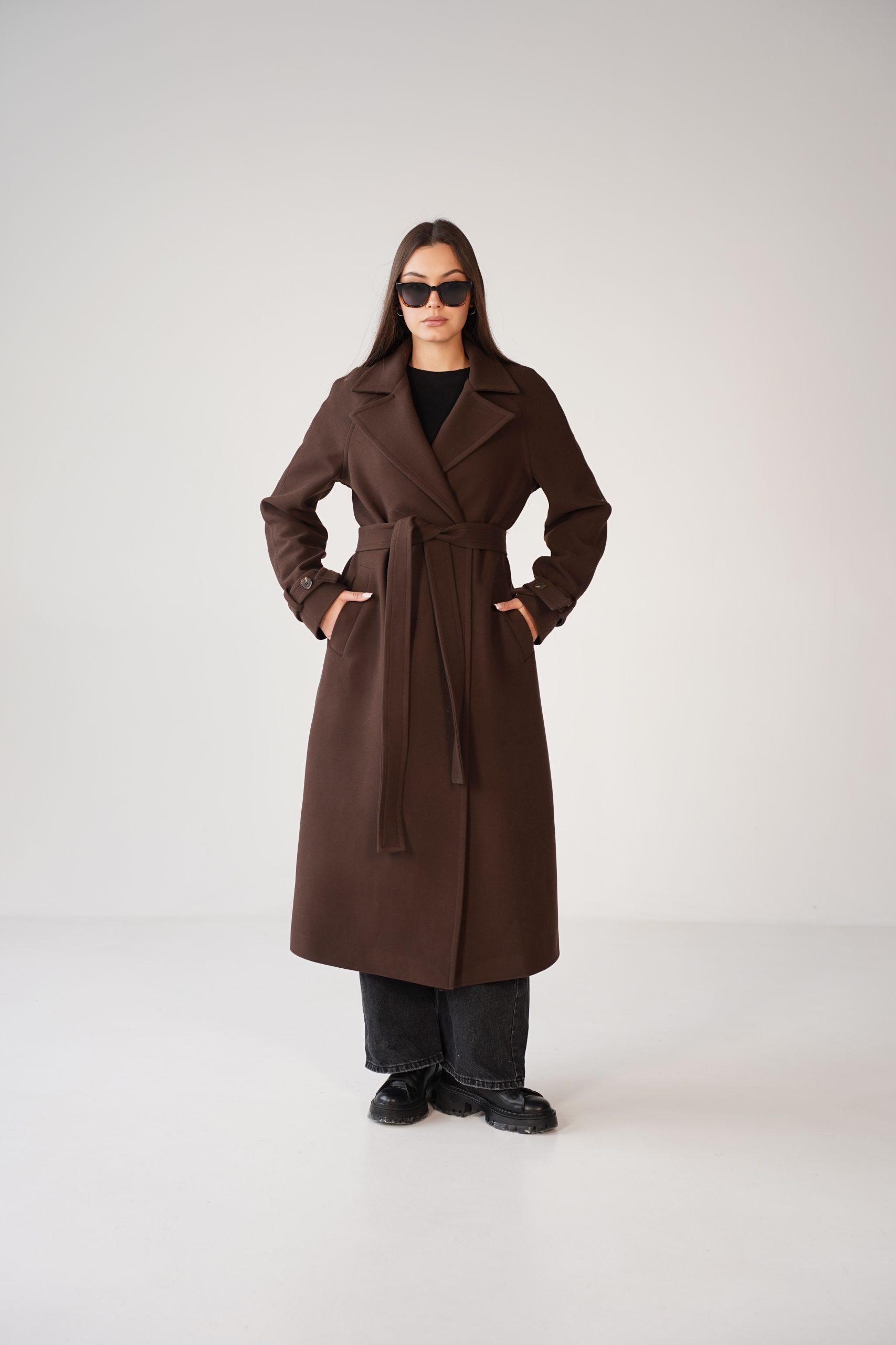 Пальто доповнено класичними лацканами, які підкреслюють лінію плечей і надають образу строгість та стиль. Акуратна застібка та продуманий крій створюють лаконічний, стриманий дизайн, що ідеально підходить як для повсякденних, так і для більш формальних образів.