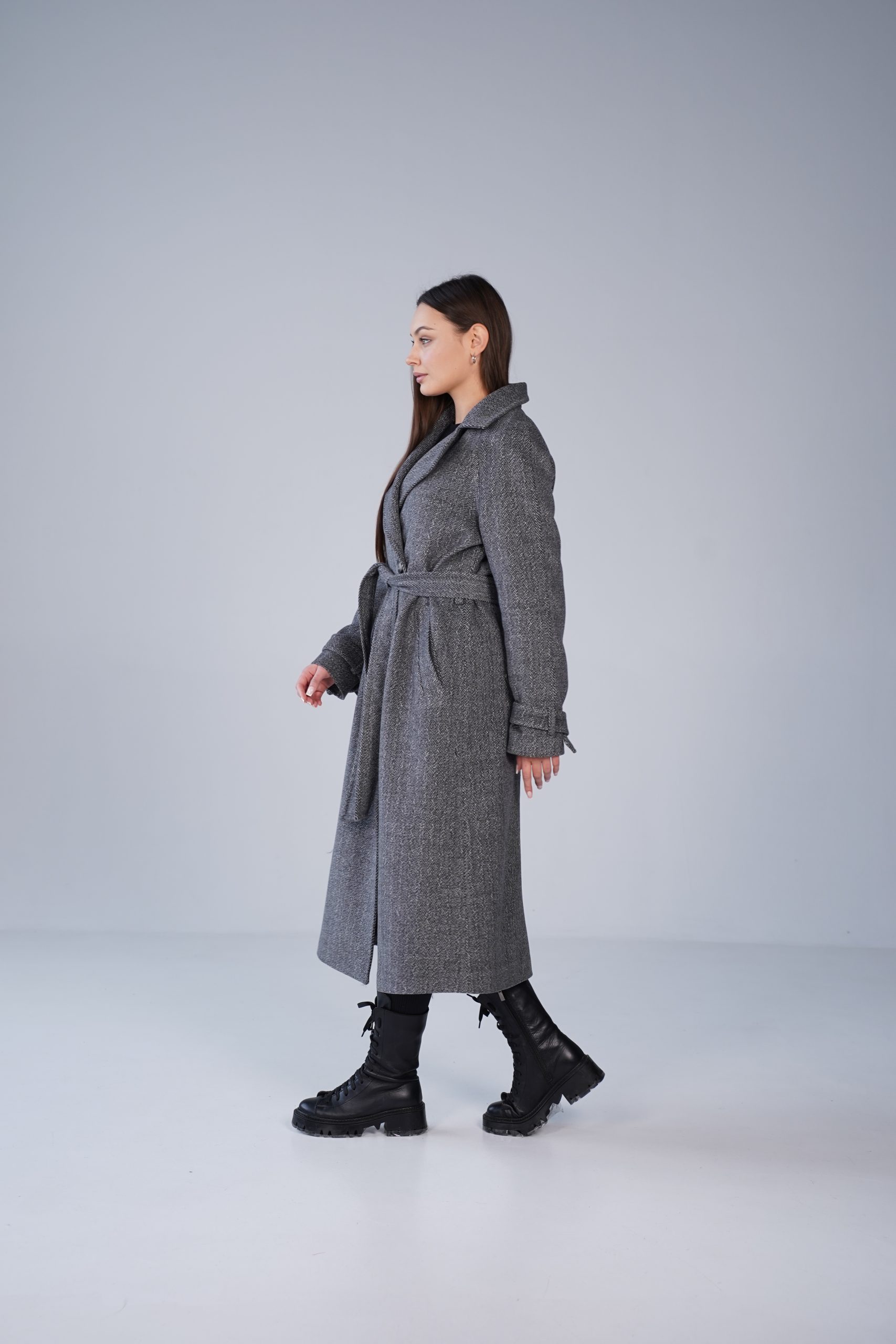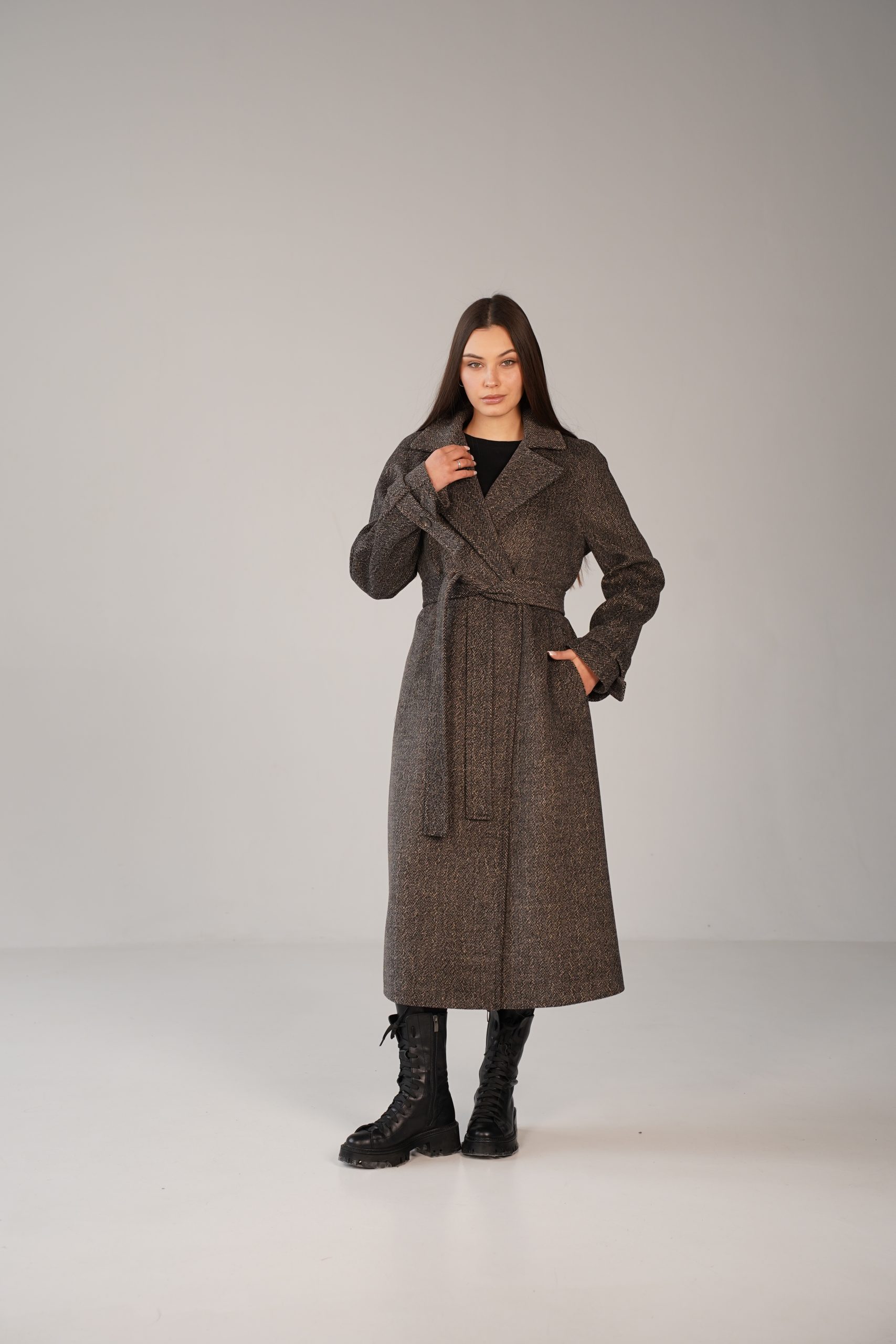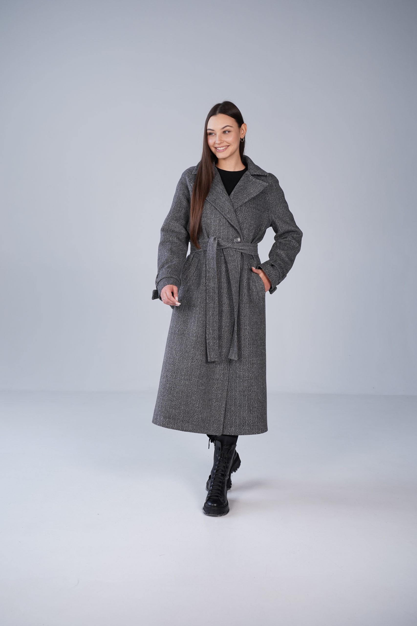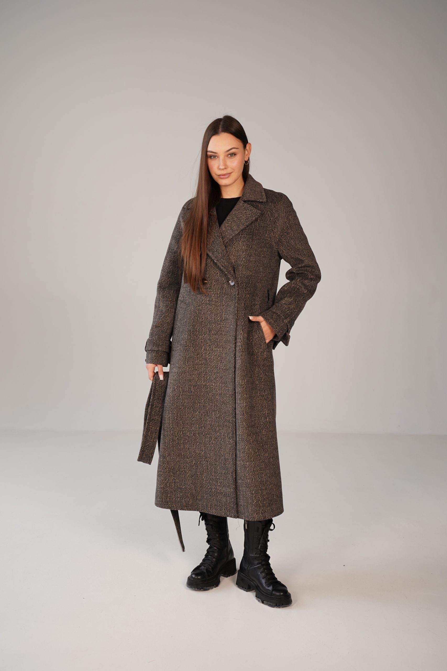 Пальто доповнено класичними лацканами, які підкреслюють лінію плечей і надають образу строгість та стиль. Акуратна застібка та продуманий крій створюють лаконічний, стриманий дизайн, що ідеально підходить як для повсякденних, так і для більш формальних образів.