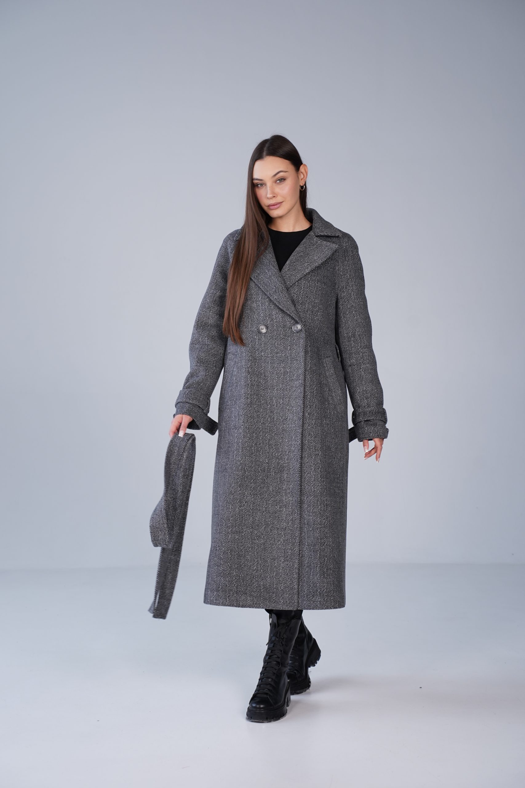 Модель має прямий подовжений силует, який візуально подовжує фігуру та створює елегантний образ. Вільний крій забезпечує комфорт при носінні і дозволяє легко одягати пальто поверх светрів або жакетів. Такий фасон робить виріб універсальним та актуальним незалежно від модних тенденцій.