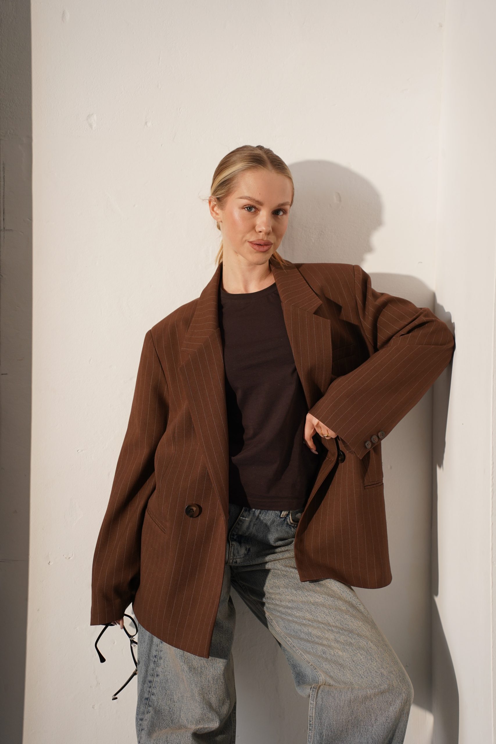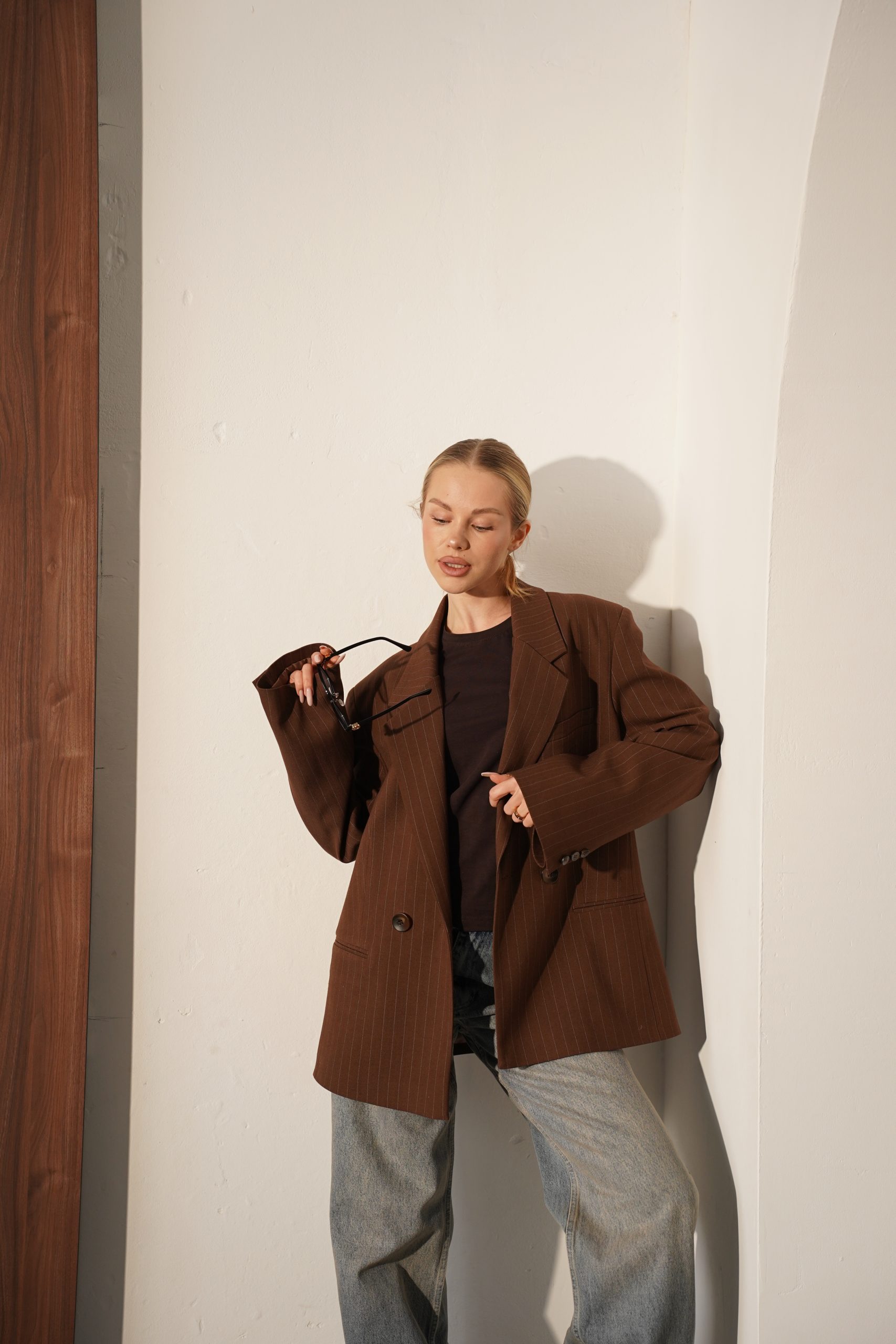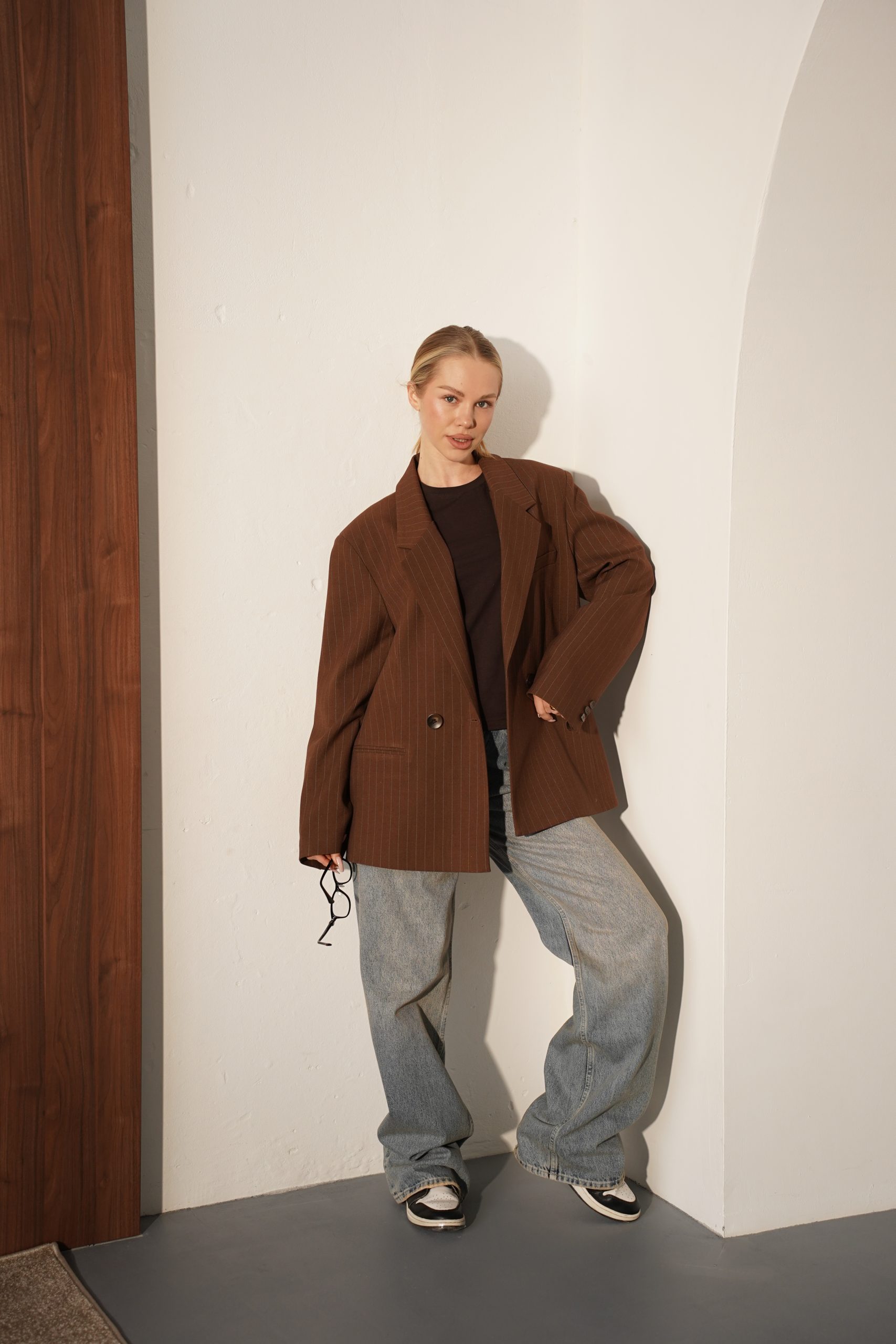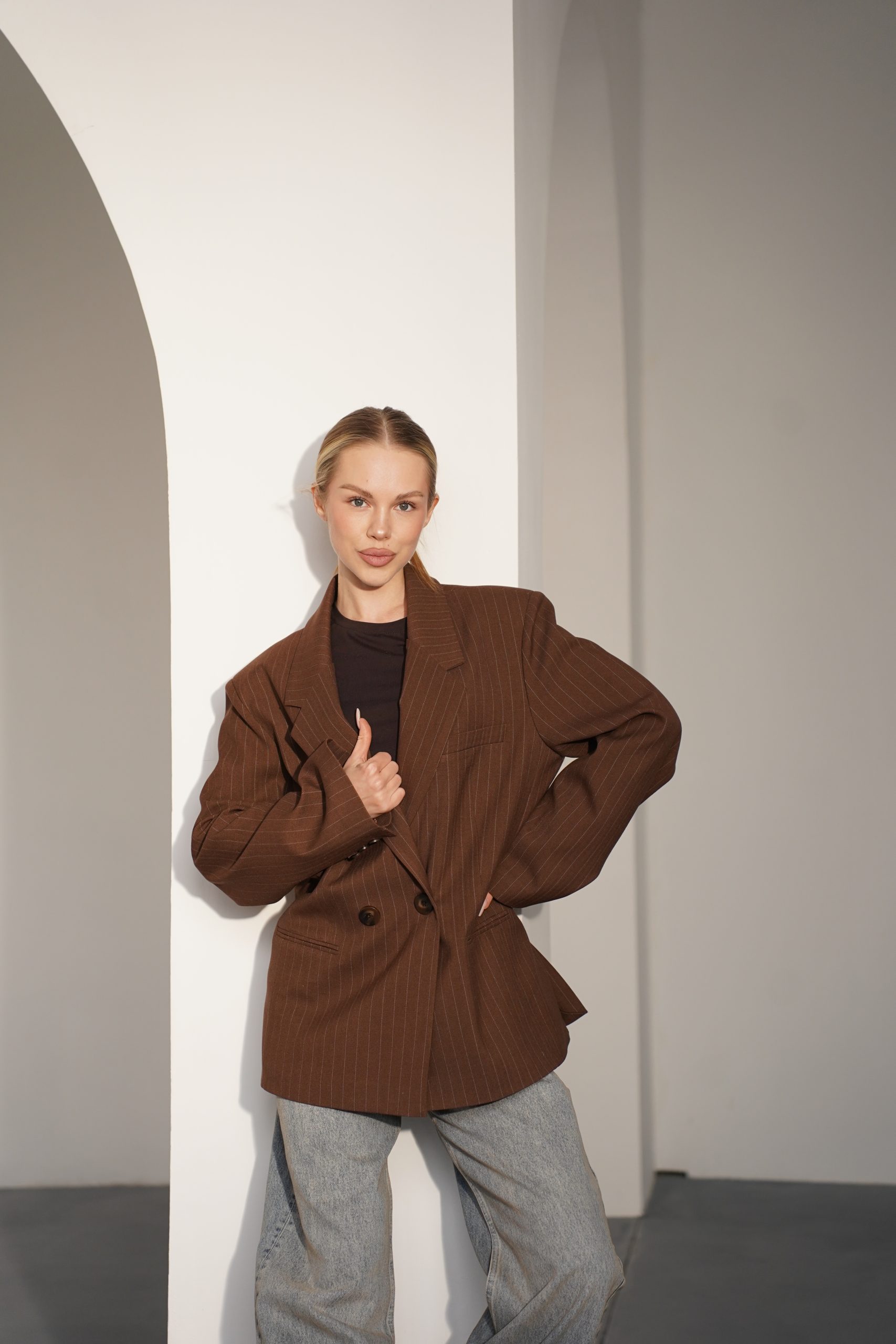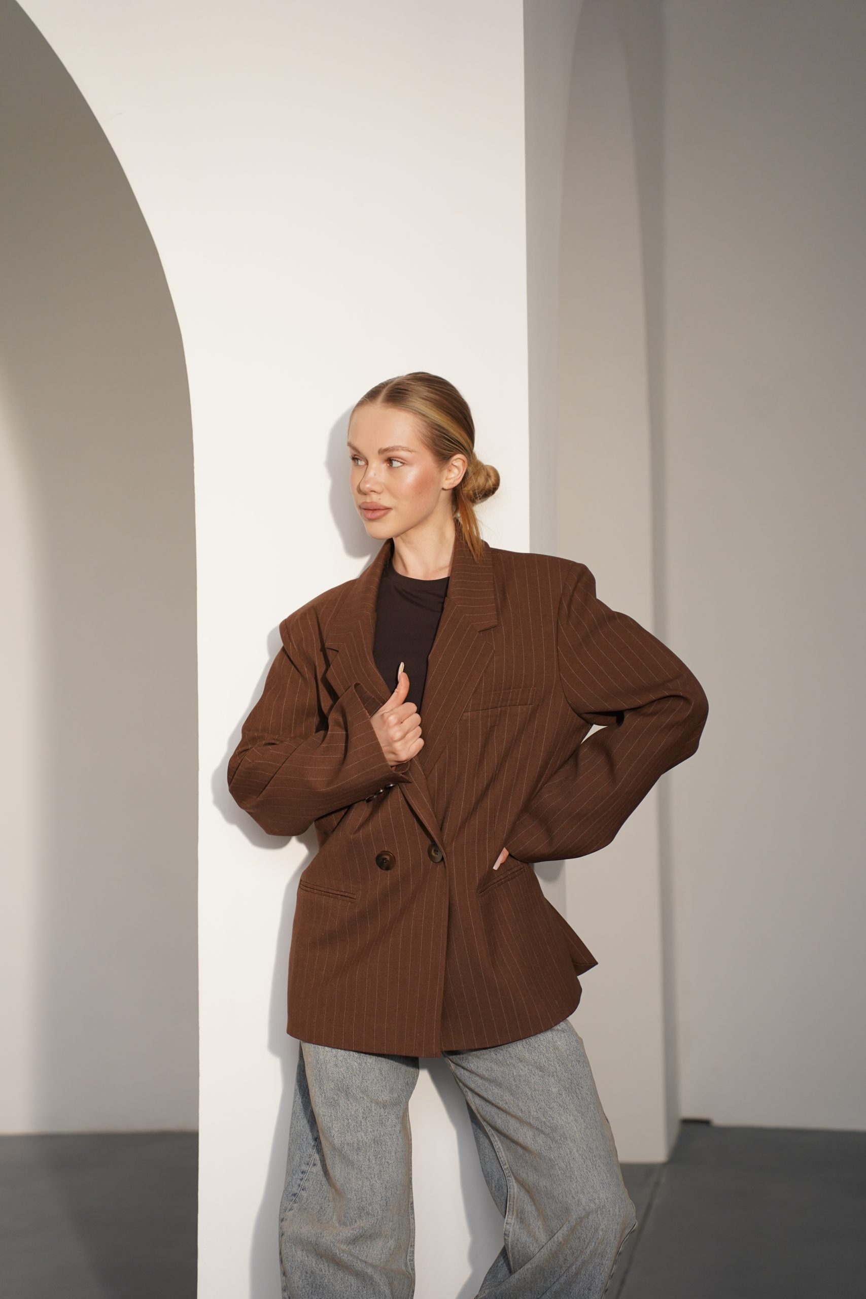 Цей стильний жакет із щільної костюмної тканини – втілення сучасної класики в естетиці oversize. Модель виконана в глибокому шоколадному відтінку, який виглядає дорого та шляхетно, легко адаптуючись під різні палітри кольорів гардеробу. Тонка, ледь помітна вертикальна смужка візуально витягує силует, додаючи образу строгості та архітектурності, характерної для преміальних виробів.